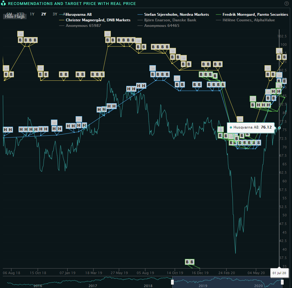 This box shows the Recommendation and Target Price vs stock price on every report that an analyst covering the stock has released. Hover over the box for more details. As always users can change the time frame on the grey axis and can select/deselect specific analysts as required.