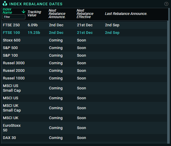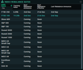 Next rebalance announcement – The date when the Index provider announces any additions and deletions from the current index (note sometimes index changes are also made outside of this official announcement date).