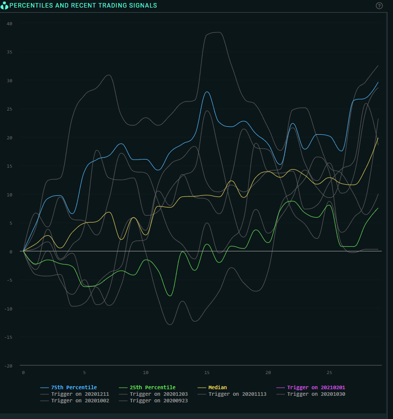 This chart shows you the percentage moves of the stock in the days following all the previous times the signal was triggered. Each line chart represents a previous signal and you can see % return versus days. You can see from the chart axis, the date on which the signal was fired or you can hover over the lines.