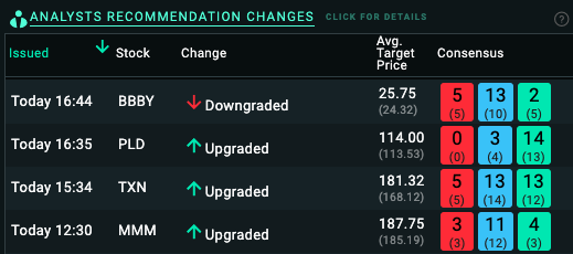This box shows Analyst recommendation changes within your selected universe. You see the time of the Recommendation change and the TP (12 month forward target price) change with the old TP in brackets under the new TP.