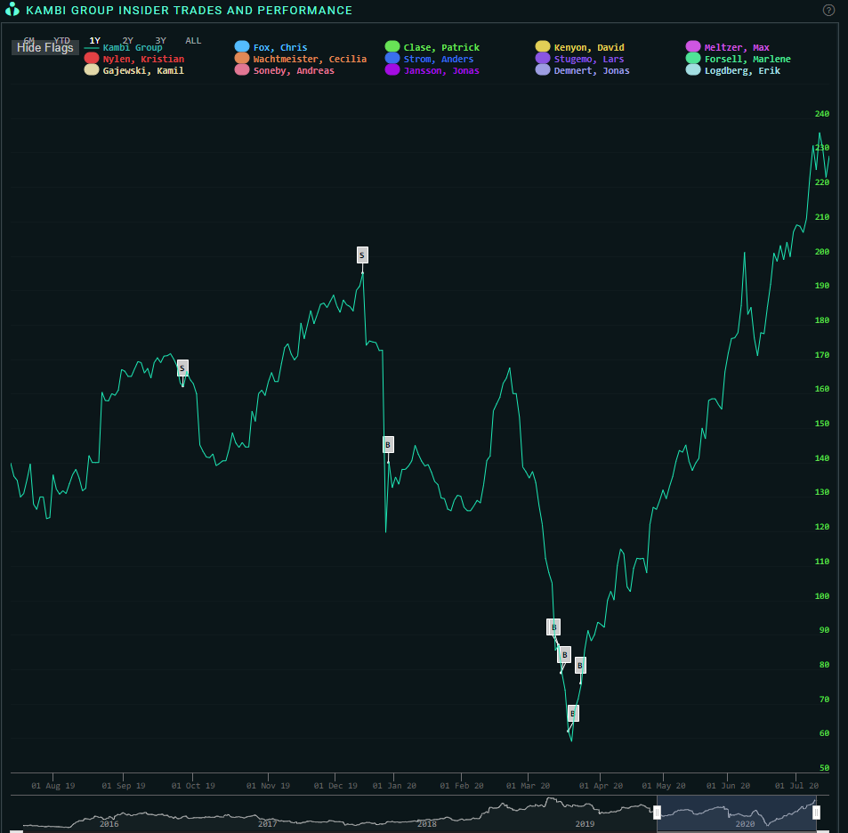 The chart shows all insider trades within the time period selected. You can click the names at the top labelled by color to select and deselect insiders on the chart. The grey scroll at the bottom can be dragged left and right to change the date range of the chart to go back up to five years.