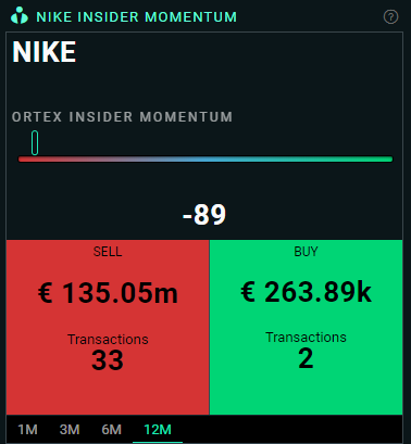 ORTEX aggregate the total value of Insider transactions and display them as total BUYS and SELLS with number of individual transactions labelled below. The default time period is 12 months but users can select 1M, 3M and 6M if they prefer.
