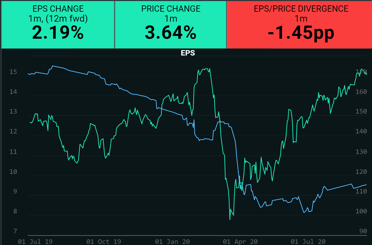 Earnings multiples are the foundation for most stock prices. ORTEX EPS momentum tracks analysts’ upgrades and downgrades of stock estimates, using the most accurate intra-day data. ORTEX provides a unique insight into corporate EPS growth to show acceleration and deceleration vs. the share. Divergence of 12 month forward EPS estimates and the share price, often highlight alpha generating ideas and allows users to analyse how much earnings estimates determine a stock price.